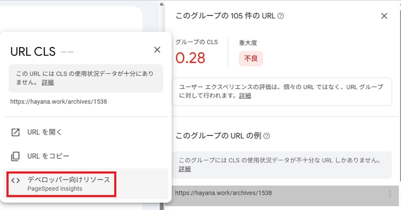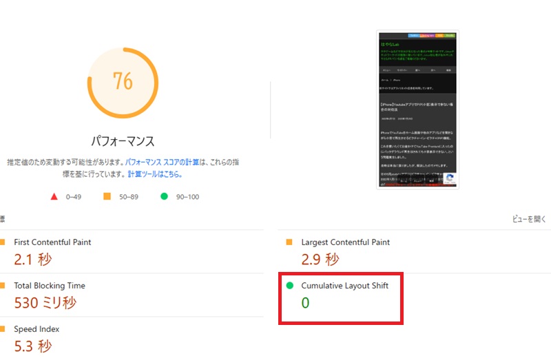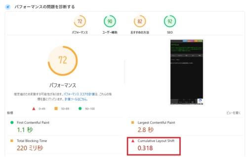 ここのCumulative Layout Shift(CLS)というページのズレなどの視覚的観点で評価している項目で不良と判断されています。