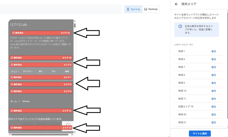 除外エリアの設定が出来たら、「サイトに適用」を押下すれば必要以上かつSEO的に邪魔な広告はなくなります。