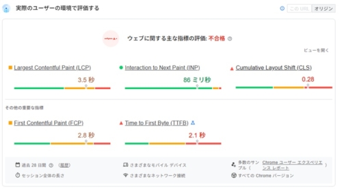 PageSpeed Insightsを開いてみるとまず最初に、「実際のユーザの環境で評価する」といった項目でウェブにかんする主な指標の評価が出てきます。