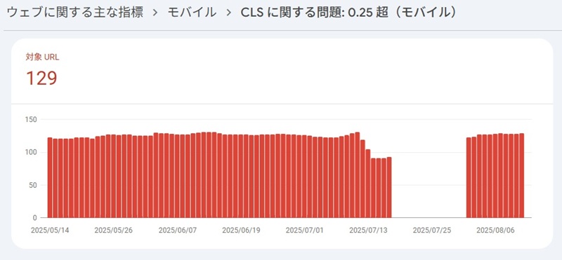 Google Search Consoleの「ウェブに関する主な指標> モバイル > CLSに関する問題: 0.25越え (モバイル)」といった部分が完全にアウトになってました。。。