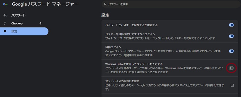 - 「Windows Hello を使用してパスワードを入力する」が画像のようにOFF状態になれば完了です!
