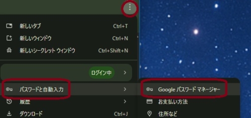 - 「パスワードと自動入力」にカーソルを合わせると出てくる「Google パスワードマネージャー」を押下します。